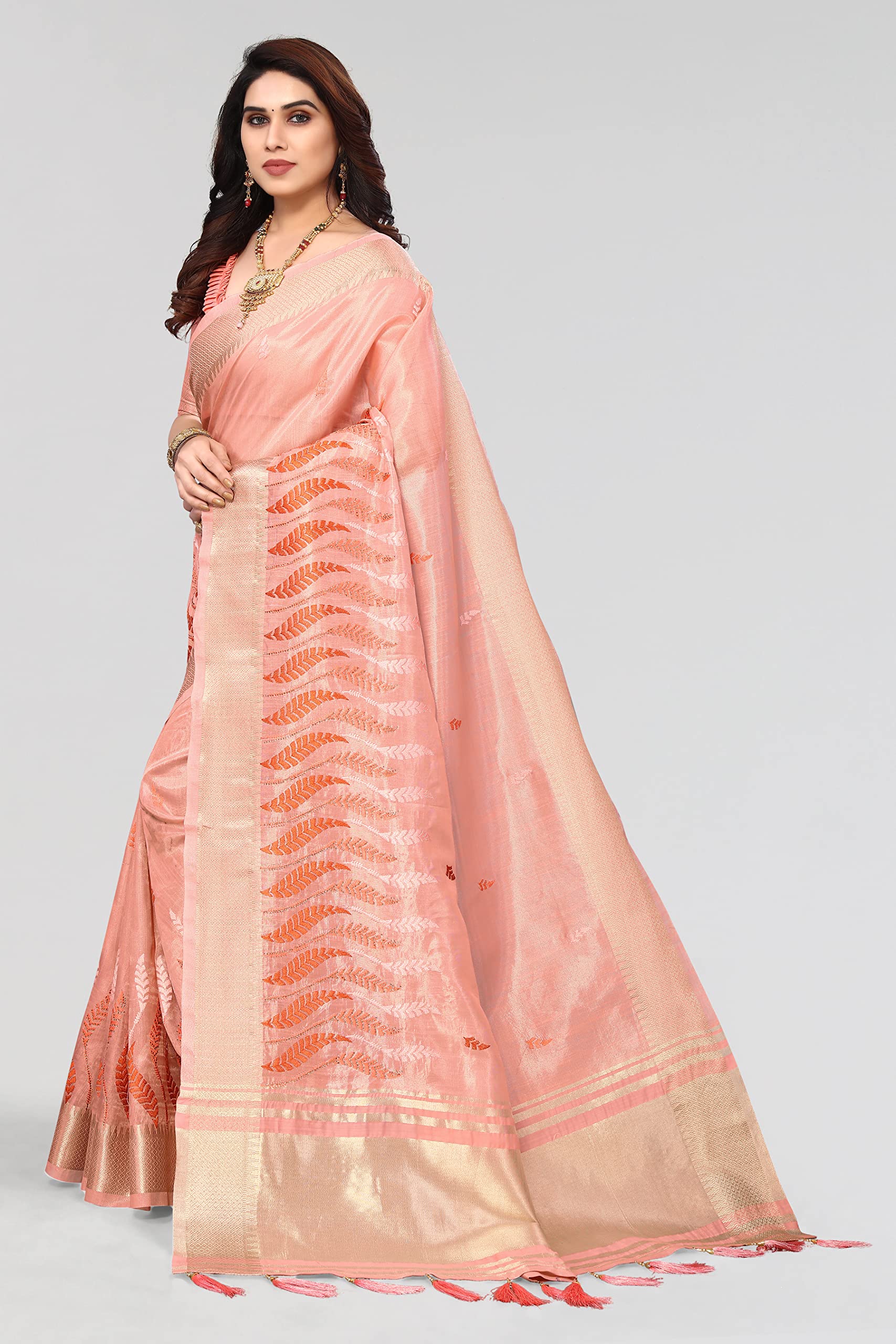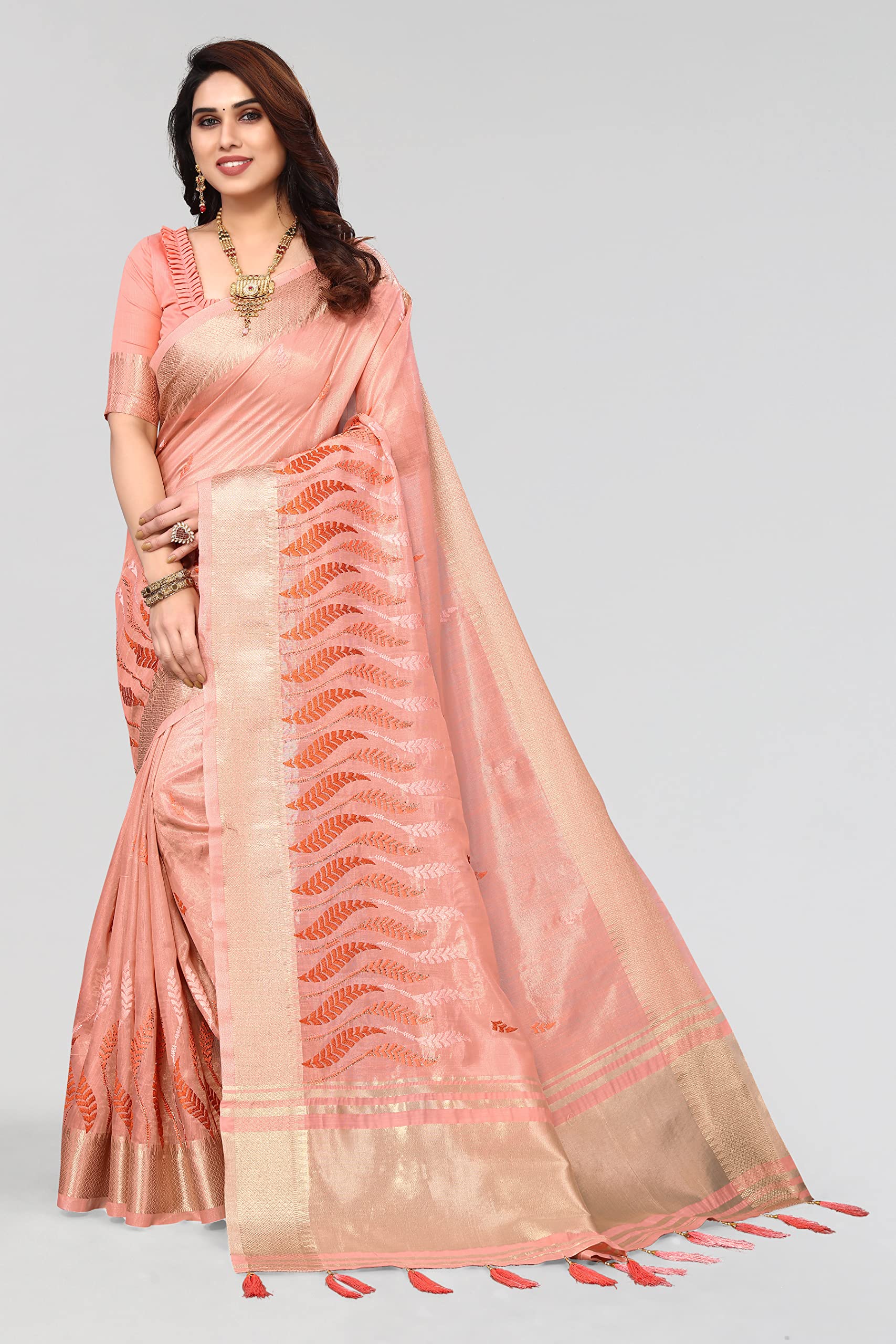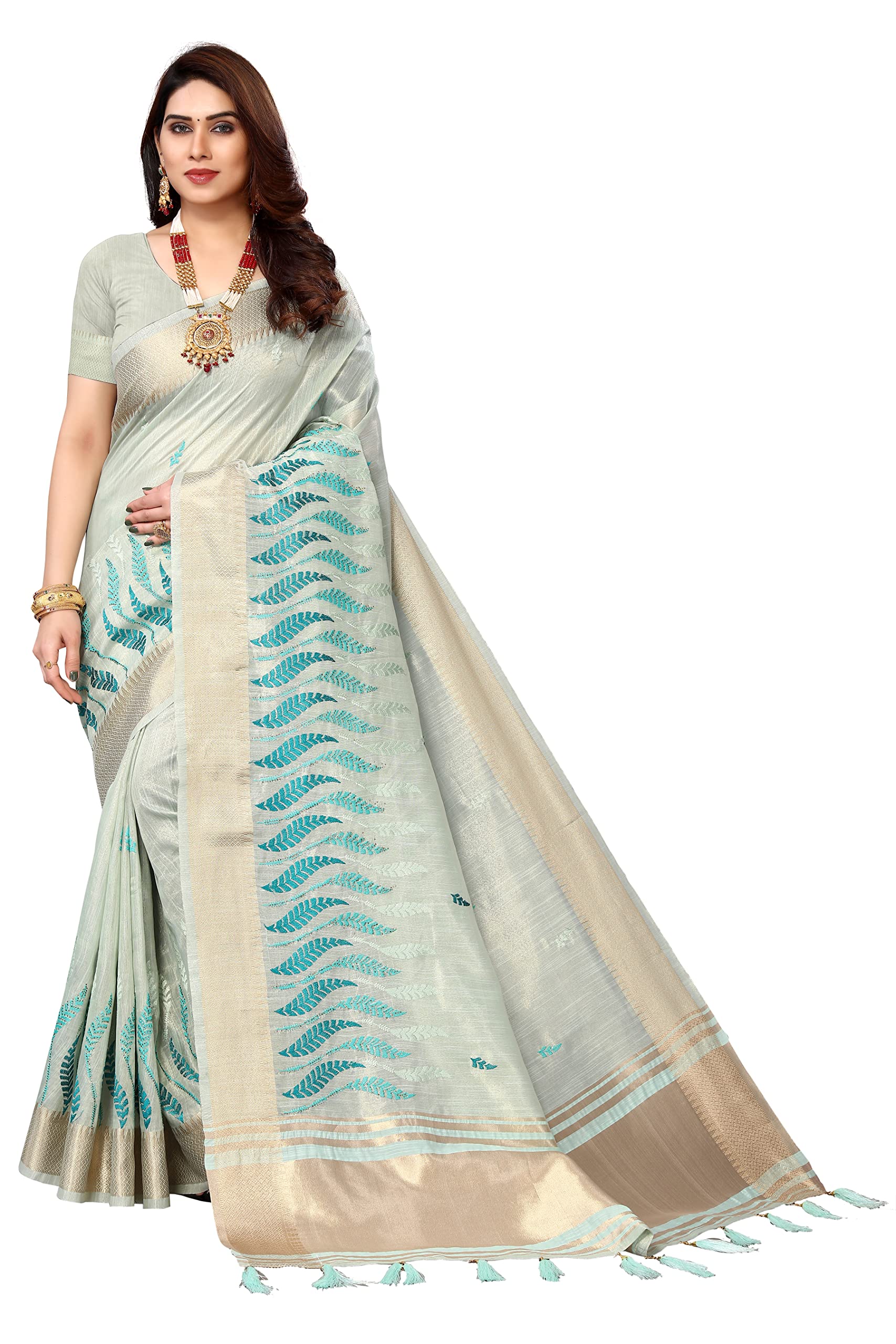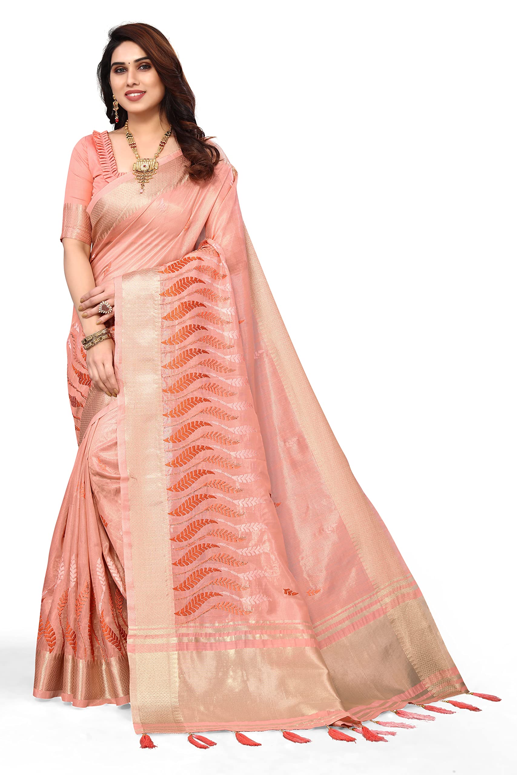 Swadeshi World Women's Cotton Blend Thread Embroidery Saree With Blouse Piece