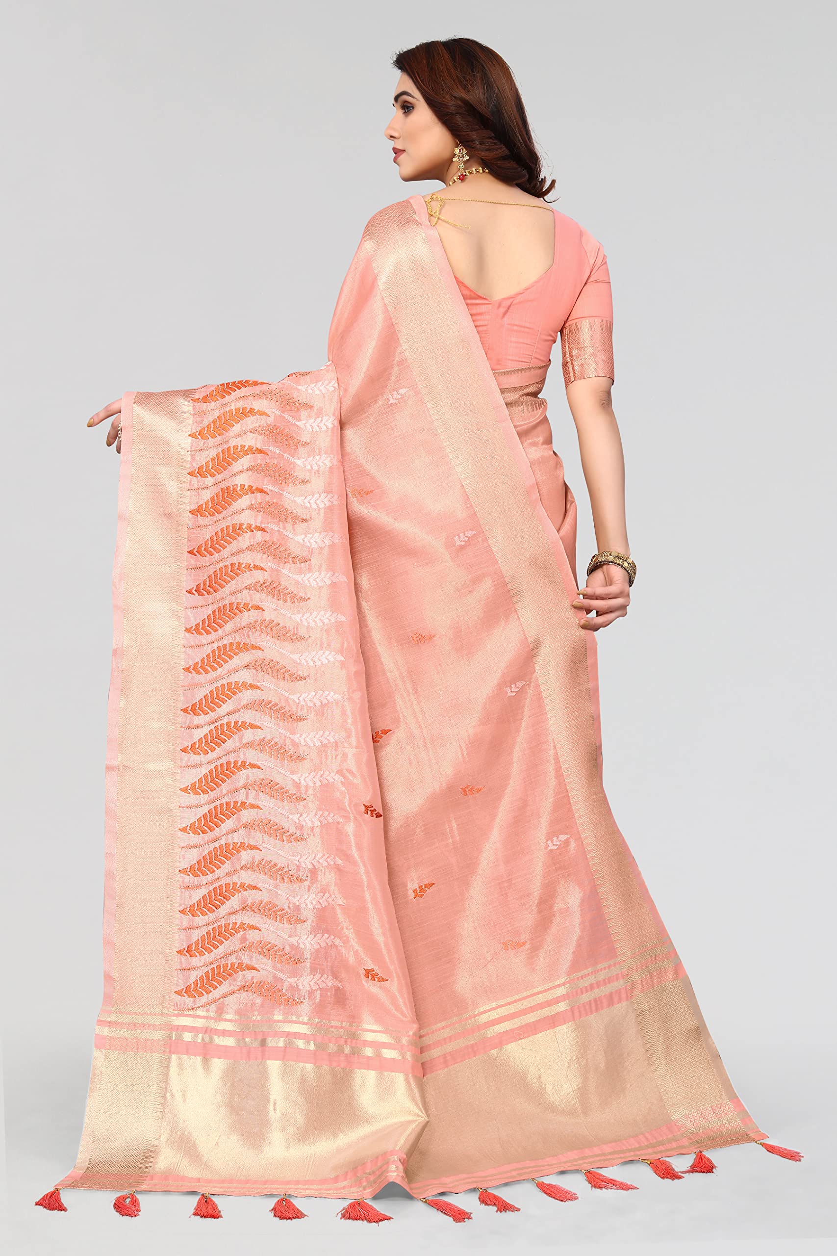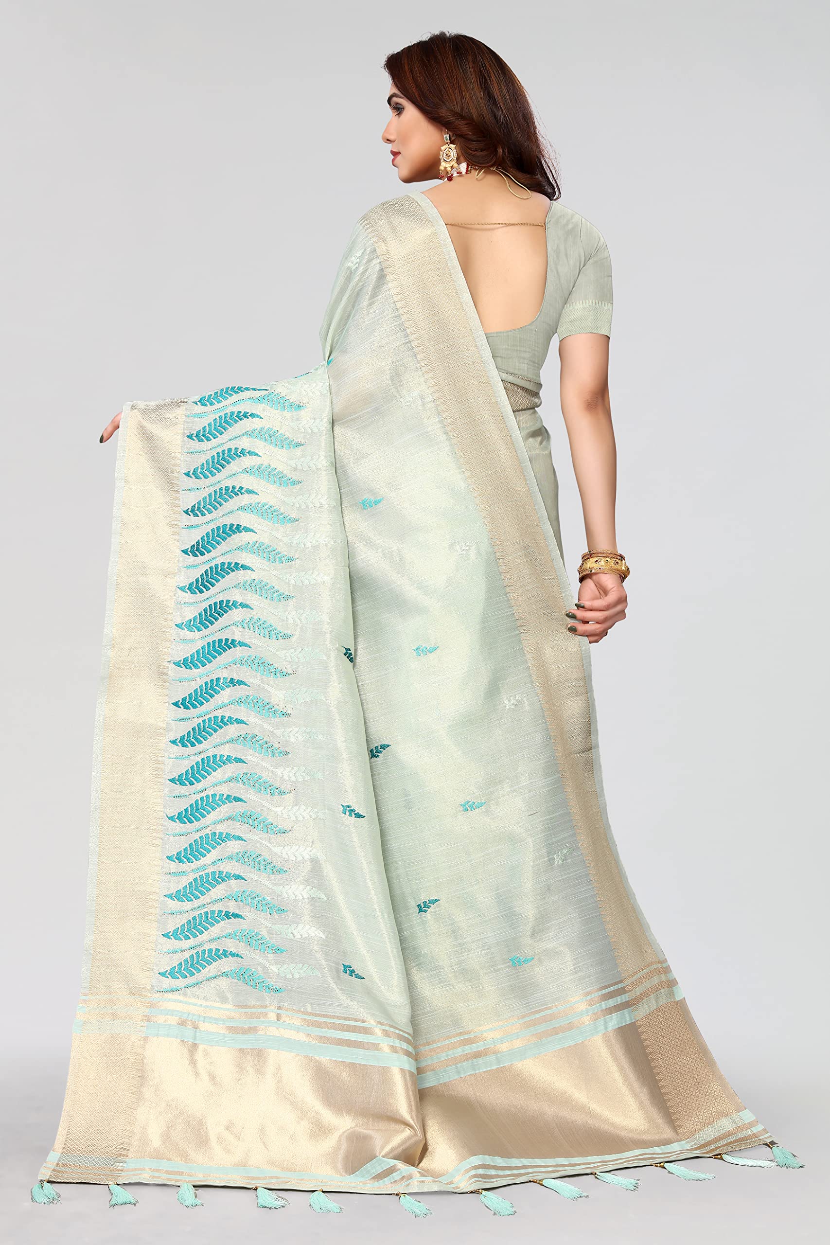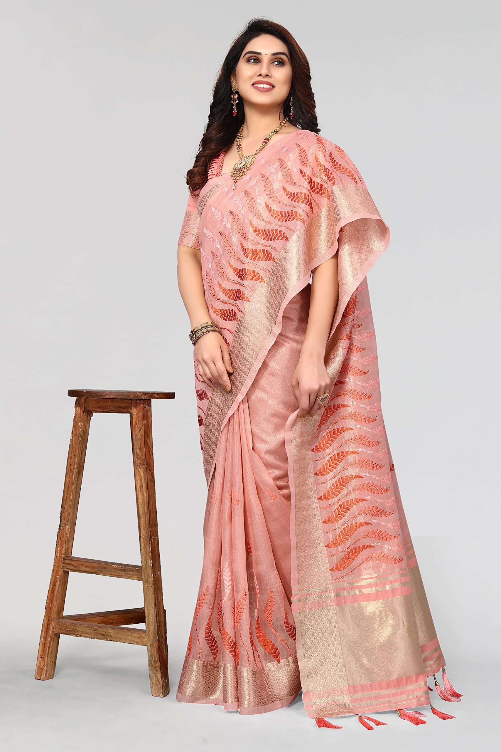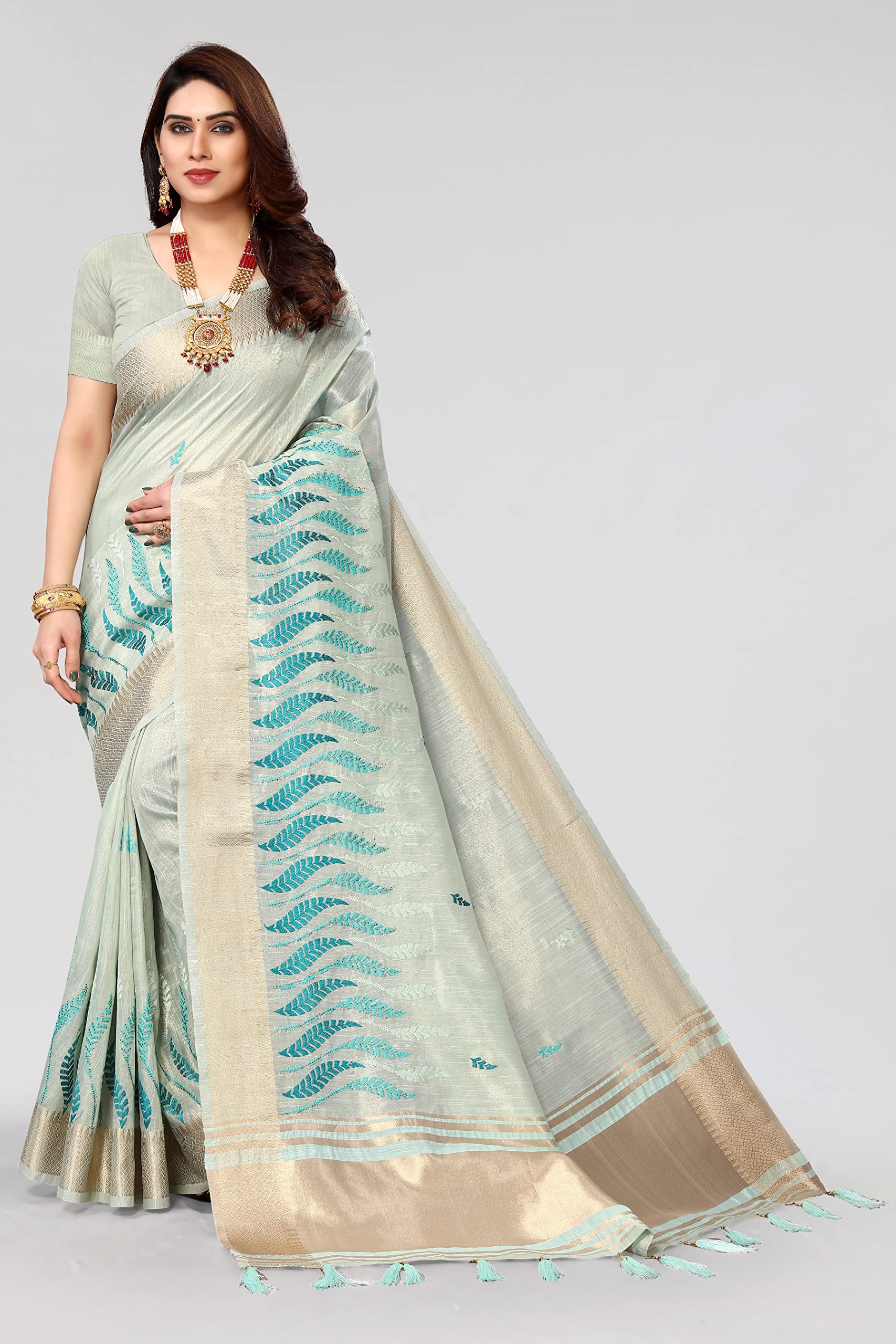 Swadeshi World Women's Cotton Blend Thread Embroidery Saree With Blouse Piece