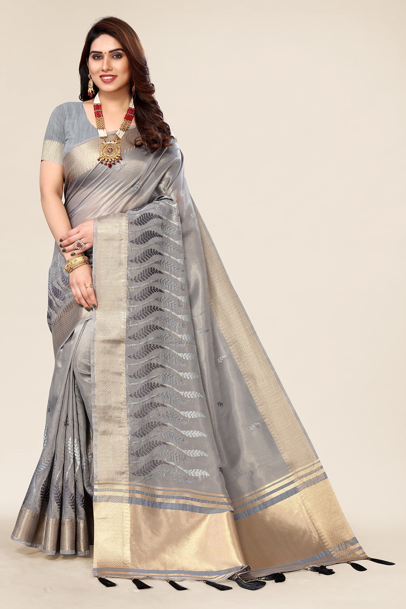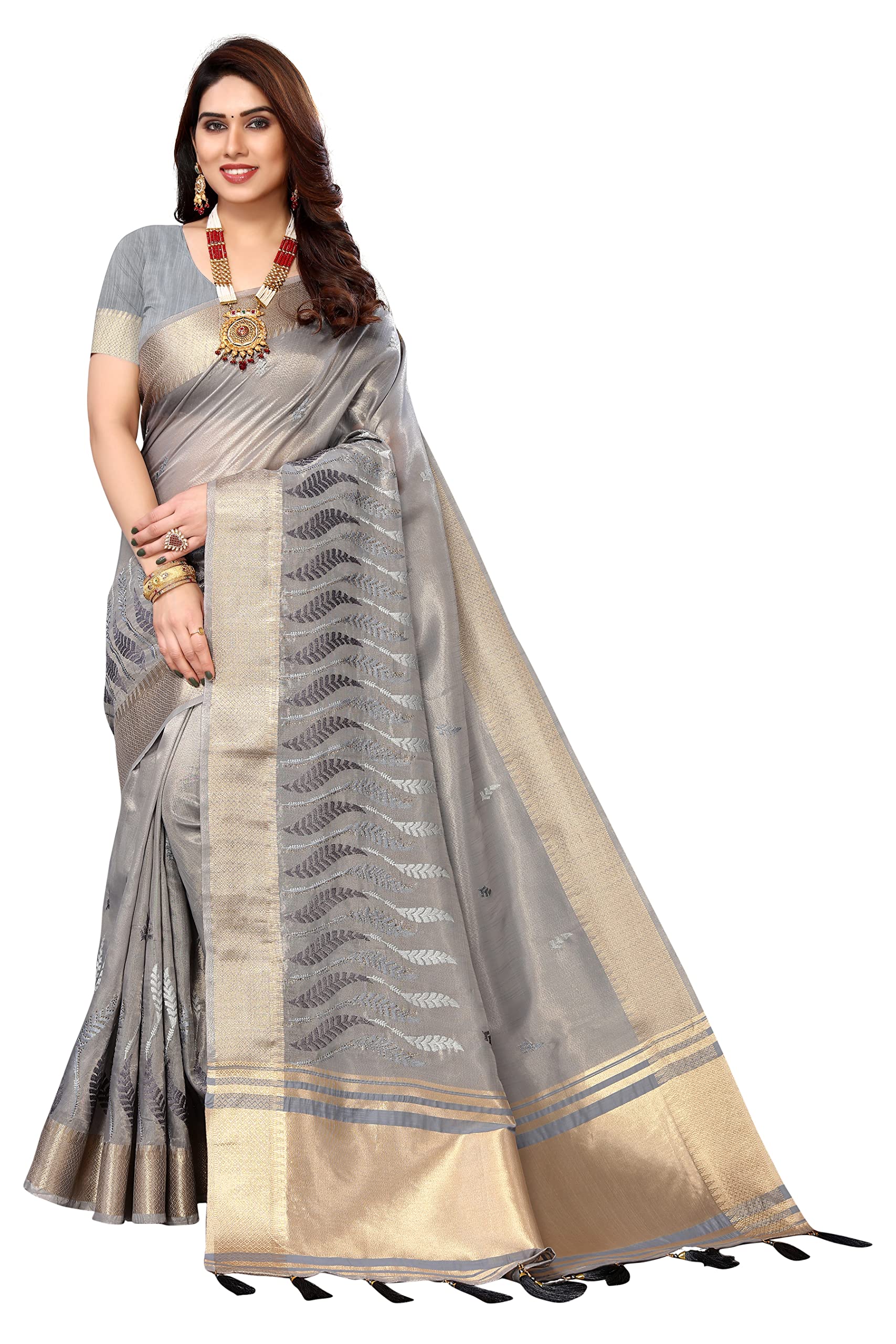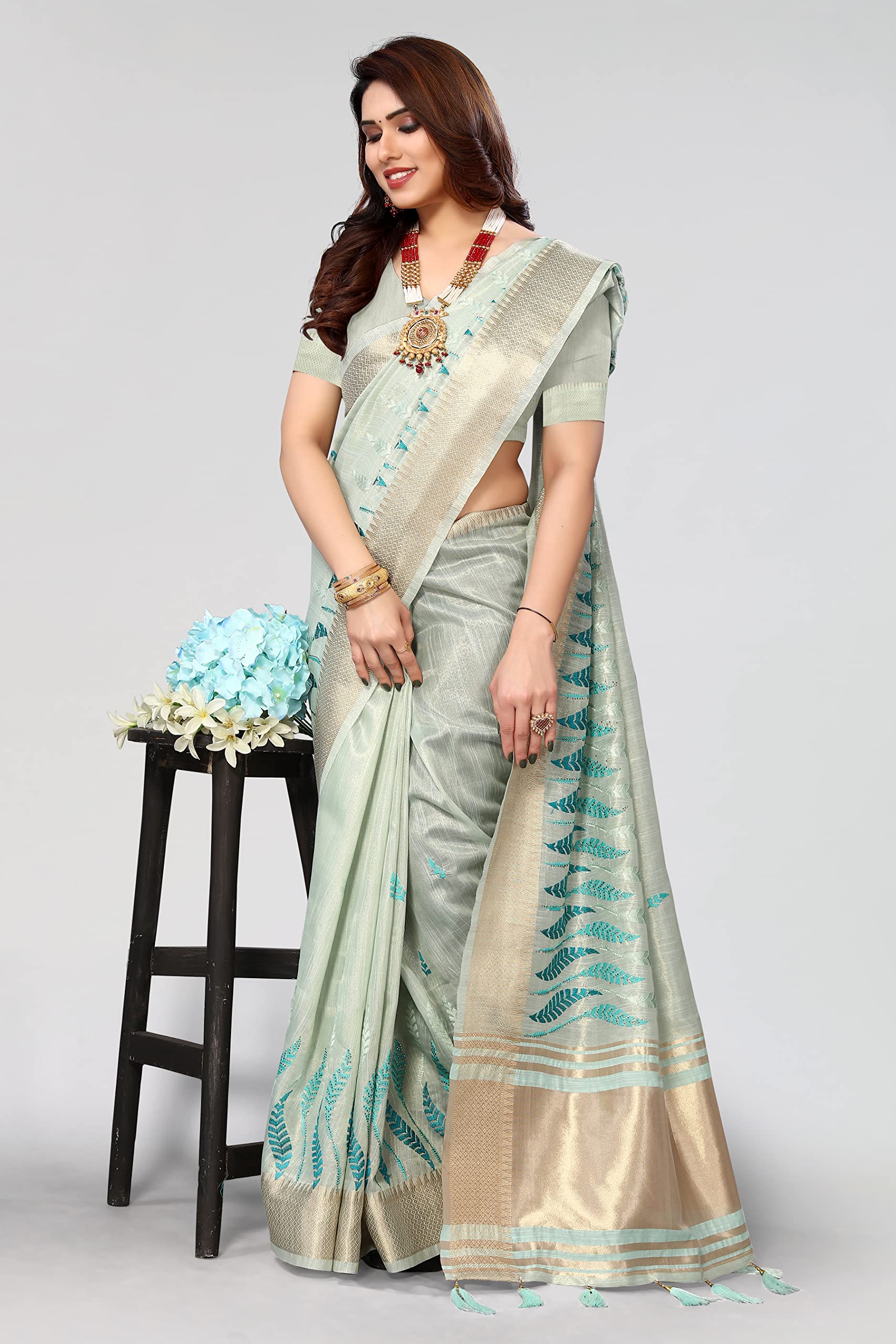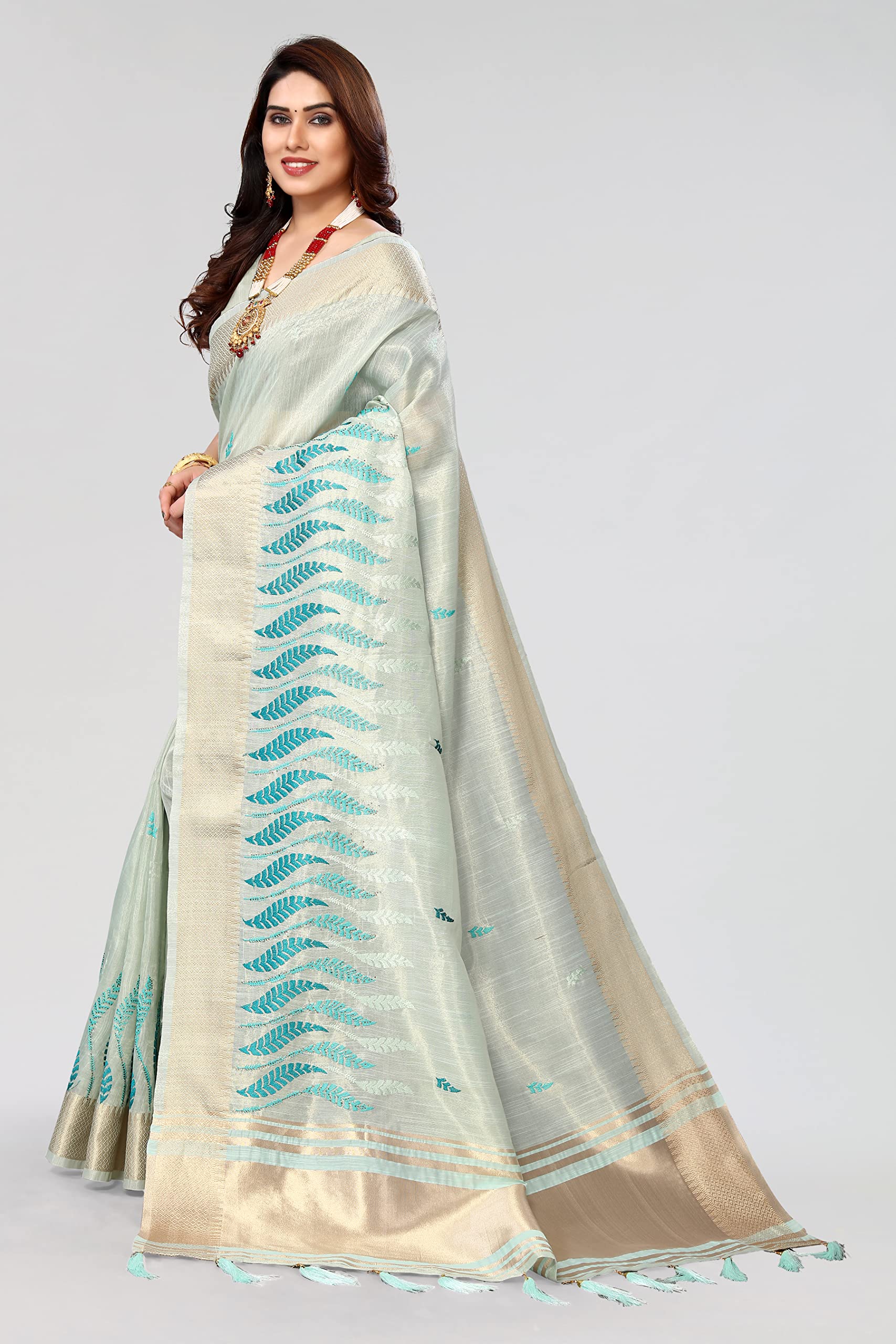 Swadeshi World Women's Cotton Blend Thread Embroidery Saree With Blouse Piece